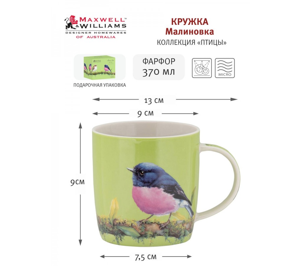 Кружка Малиновка Maxwell & Williams 0,37 литра. Мыть тёплой водой с применением жидких моющих средств. Можно использовать в СВЧ и мыть в посудомоечной машине. Подарочная коробка.