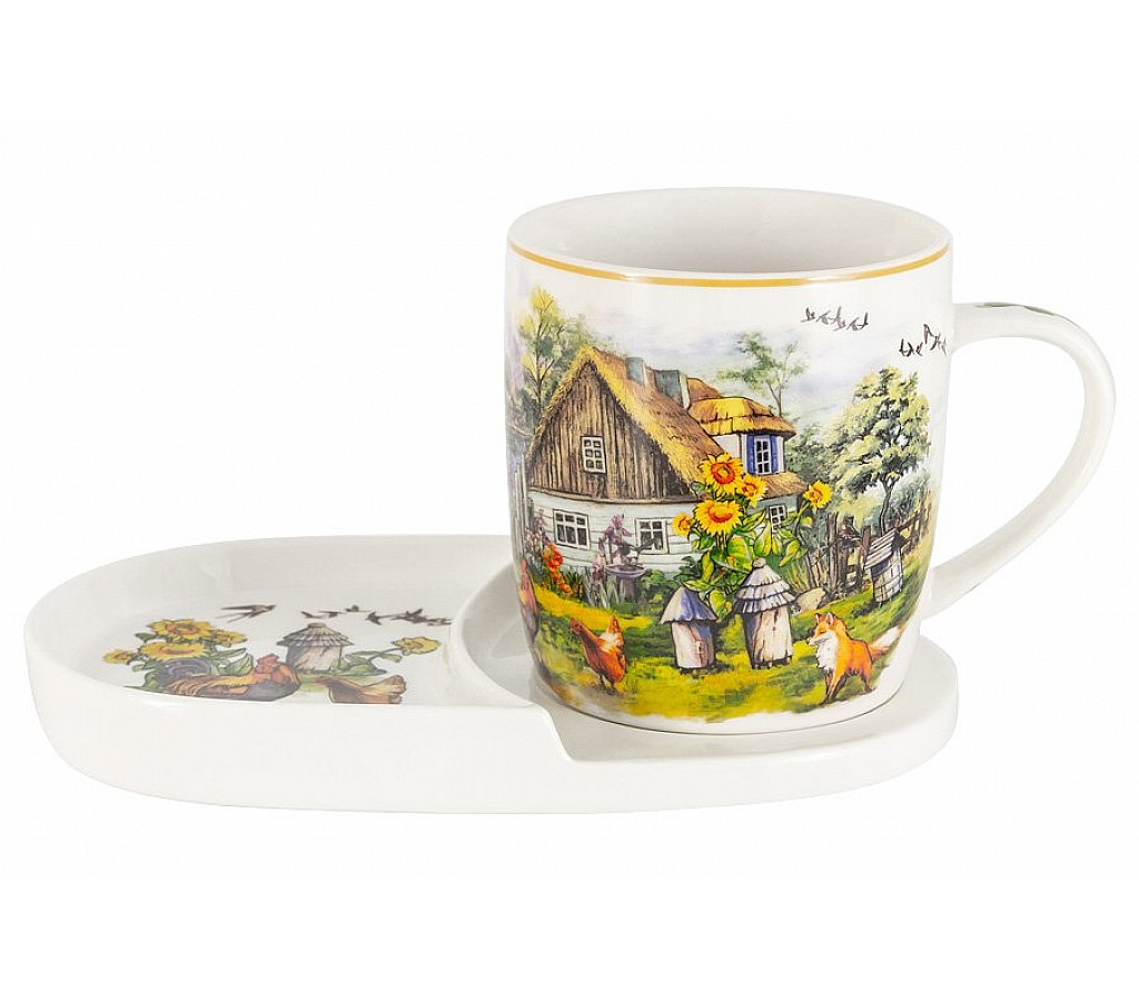 Кружка с блюдцем-подносом Carmani Ферма упакована в подарочную коробку с демонстрационным окошком. Объем 0,4 л. Блюдце-поднос 18,5х11 см.