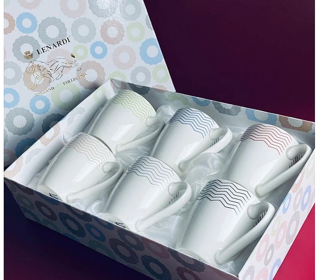 Набор из 6 кружек 380 мл Wave Lenardi изготовлен из фарфора высочайшего качества. Упакован в подарочную коробку. Можно мыть в посудомойке. Можно использовать в СВЧ-печи.