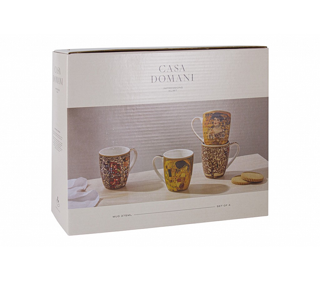 Набор из 4 кружек Климт Casa Domani объемом 0,38 л. Мыть теплой водой с применением жидких моющих средств. Можно использовать в СВЧ и посудомоечной машине.