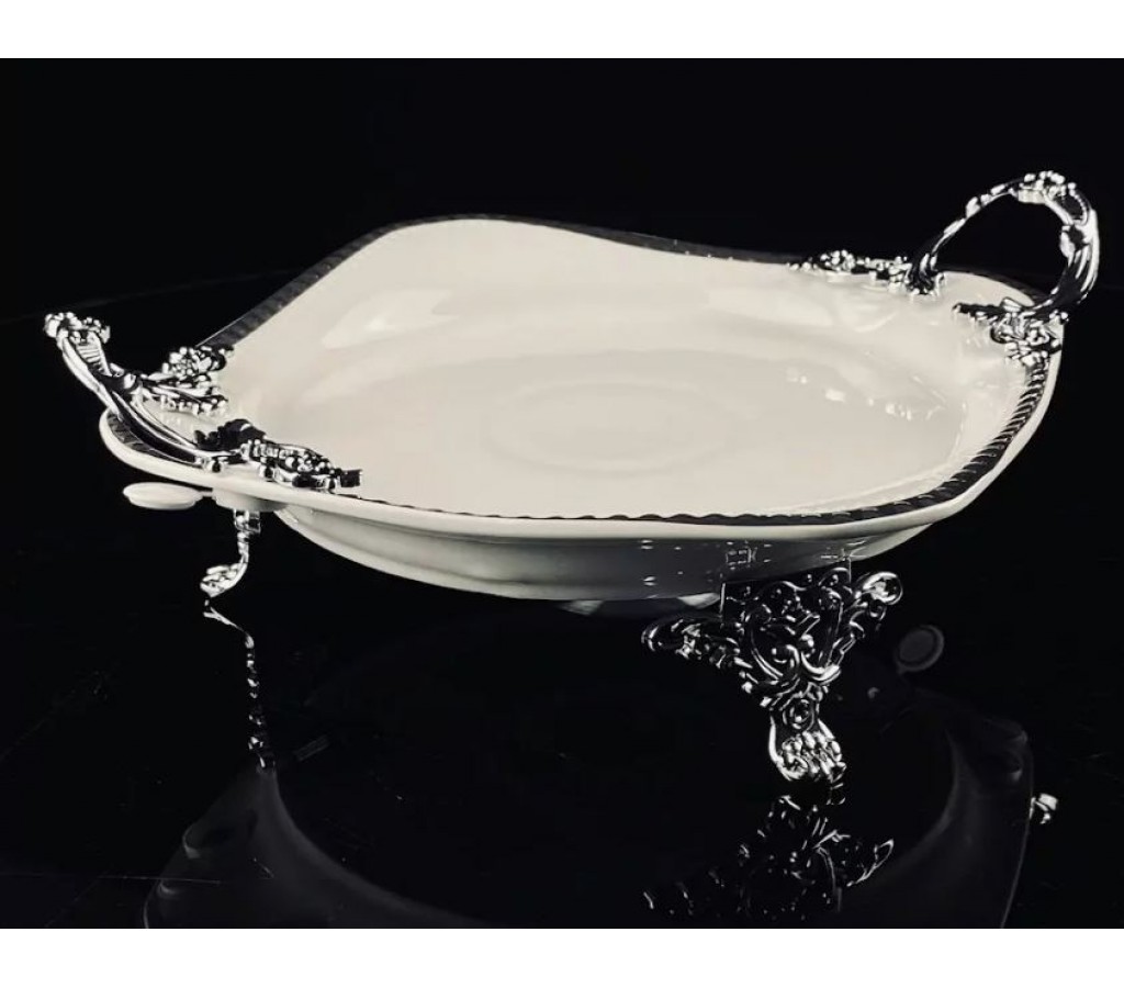 Блюдо 28 см Atlantis Lenardi на ножках с ручками изготовлено из фарфора, с рельефным краем и серебряной окантовкой. Изящные ручки и ножки изготовлены из облегчённого метала с качественным, анодированным покрытием под серебро.