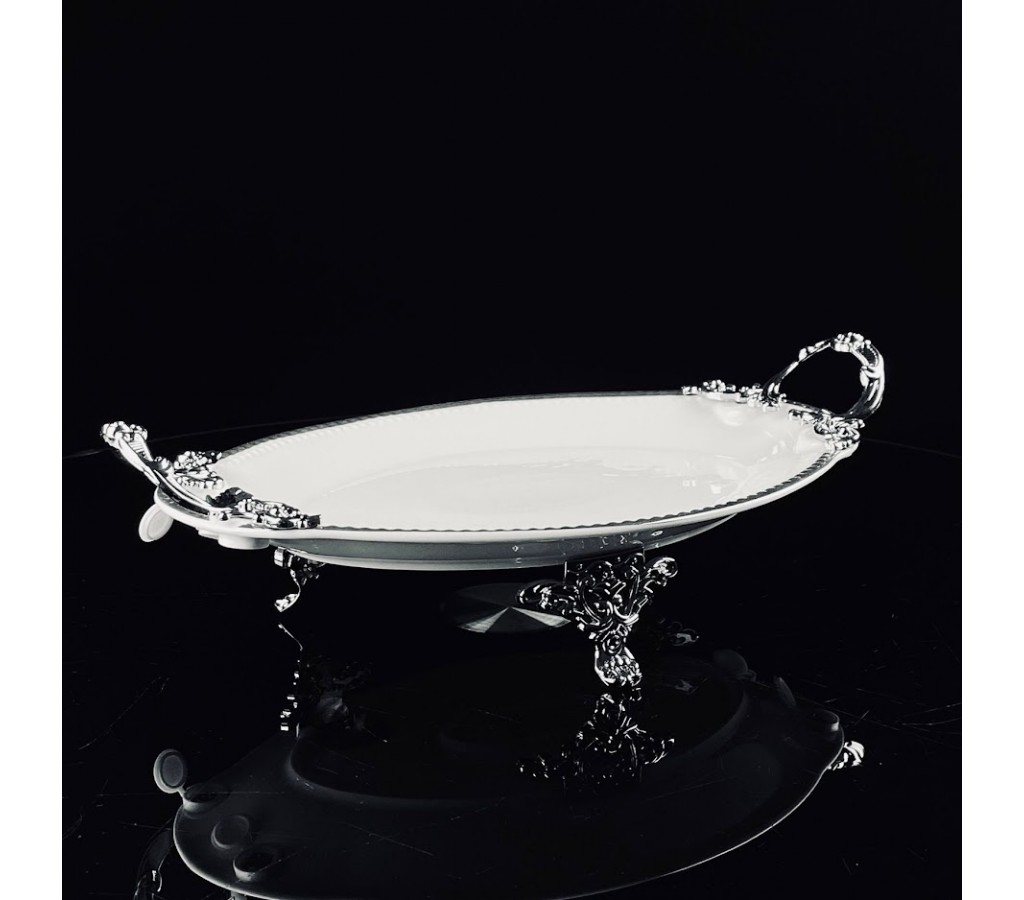 Блюдо 30 см Atlantis Lenardi на ножках с ручками изготовлено из фарфора, с рельефным краем и серебряной окантовкой. Изящные ручки и ножки изготовлены из облегчённого метала с качественным, анодированным покрытием под серебро.