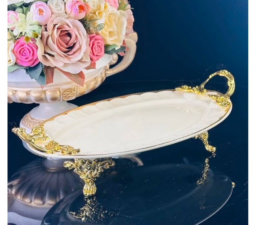 Блюдо 31 см Atlantis Cream Lenardi на ножках с ручками изготовлено из фарфора, с рельефным краем и золотой окантовкой. Изящные ручки и ножки изготовлены из облегчённого метала с качественным, анодированным покрытием под золото.