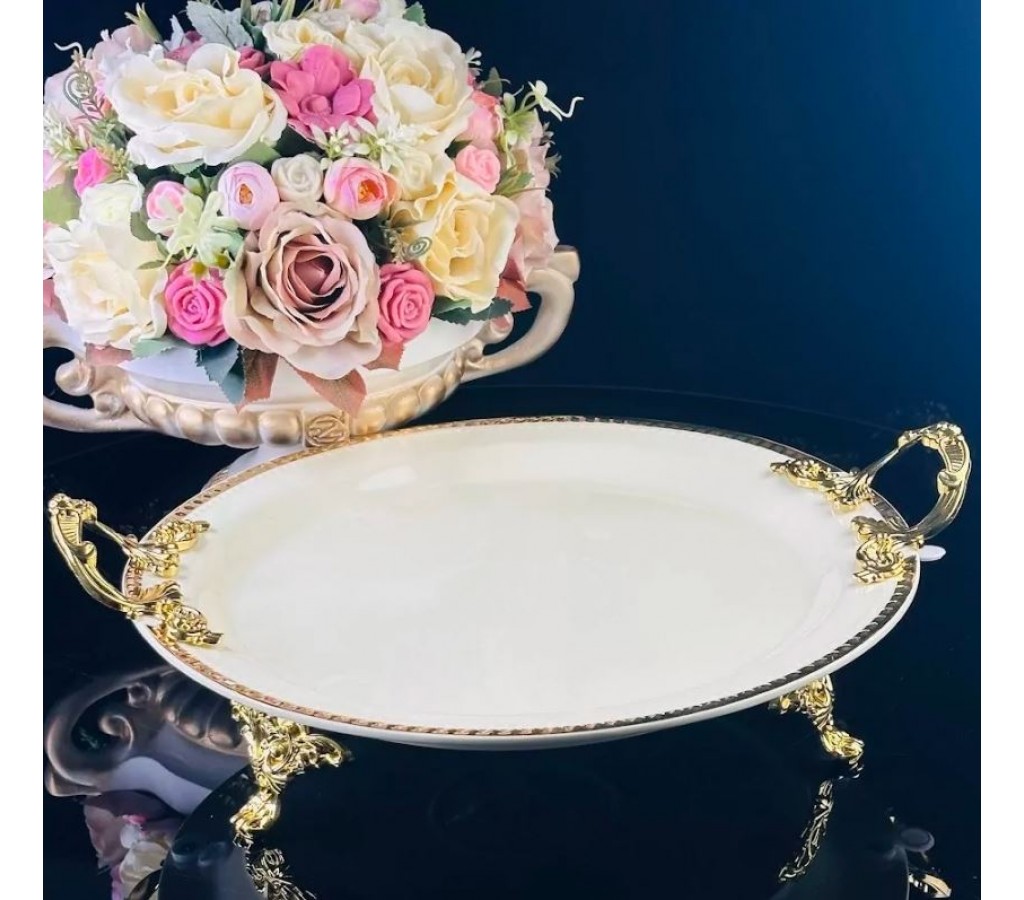 Блюдо 35,5 см Atlantis Cream Lenardi на ножках с ручками изготовлено из фарфора, с рельефным краем и золотой окантовкой. Изящные ручки и ножки изготовлены из облегчённого метала с качественным, анодированным покрытием под золото.