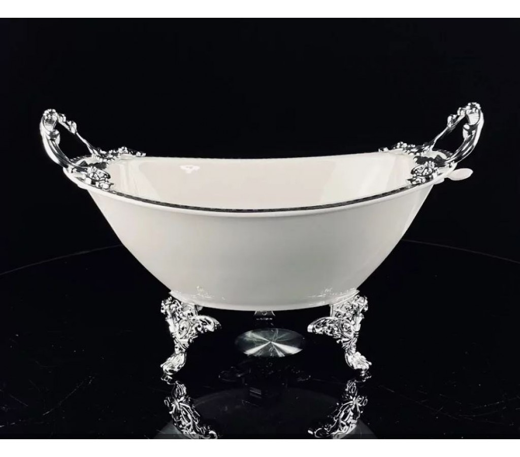 Блюдо глубокое 31 см Atlantis Lenardi на ножках с ручками изготовлено из фарфора, с рельефным краем и серебряной окантовкой. Изящные ручки и ножки изготовлены из облегчённого метала с качественным, анодированным покрытием под серебро.