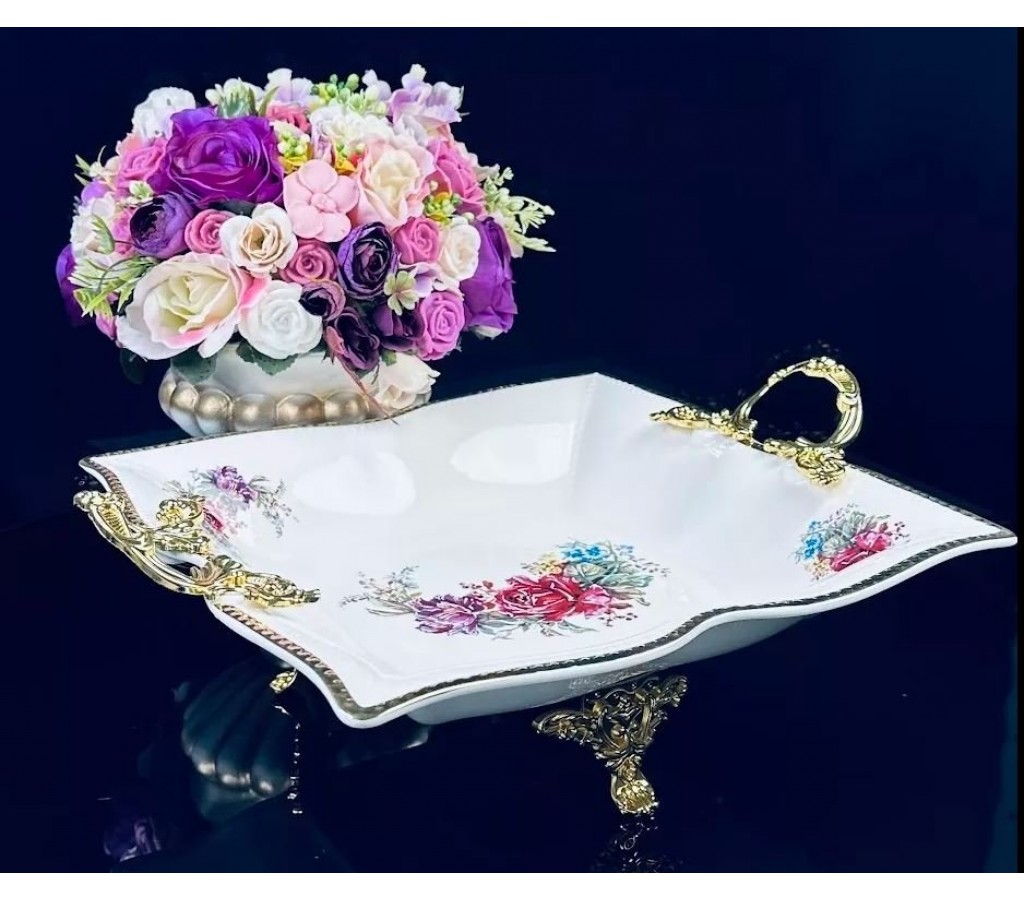 Блюдо квадратное 34 см Астории на ножках с ручками из фарфора подойдет для сервировки праздничного стола. Подарочная упаковка. Нельзя мыть в посудомоечной машине.