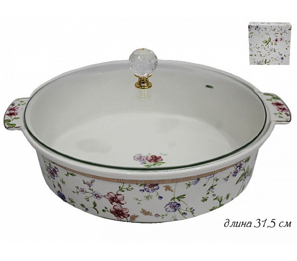 Блюдо Lenardi Розали 31 см с крышкой. Содержит золотистые элементы декора, не предназначен для использования в микроволновой печи. Рекомендуется ручная мойка без использования абразивных средств.