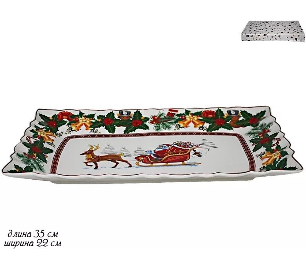 Блюдо прямоугольное Новогодний Lenardi длиной 35 см. Шириной 22 см. Рекомендуется мыть руками и не использовать в микроволновой печи. Упаковано в подарочную коробку.