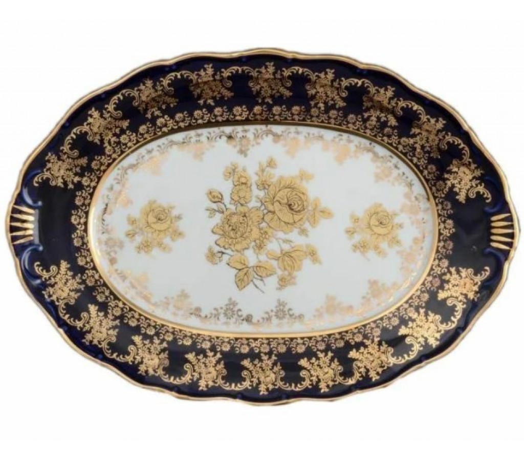 Блюдо овальное 32 см Офелия Золотая роза Кобальт Мелкий узор MZ