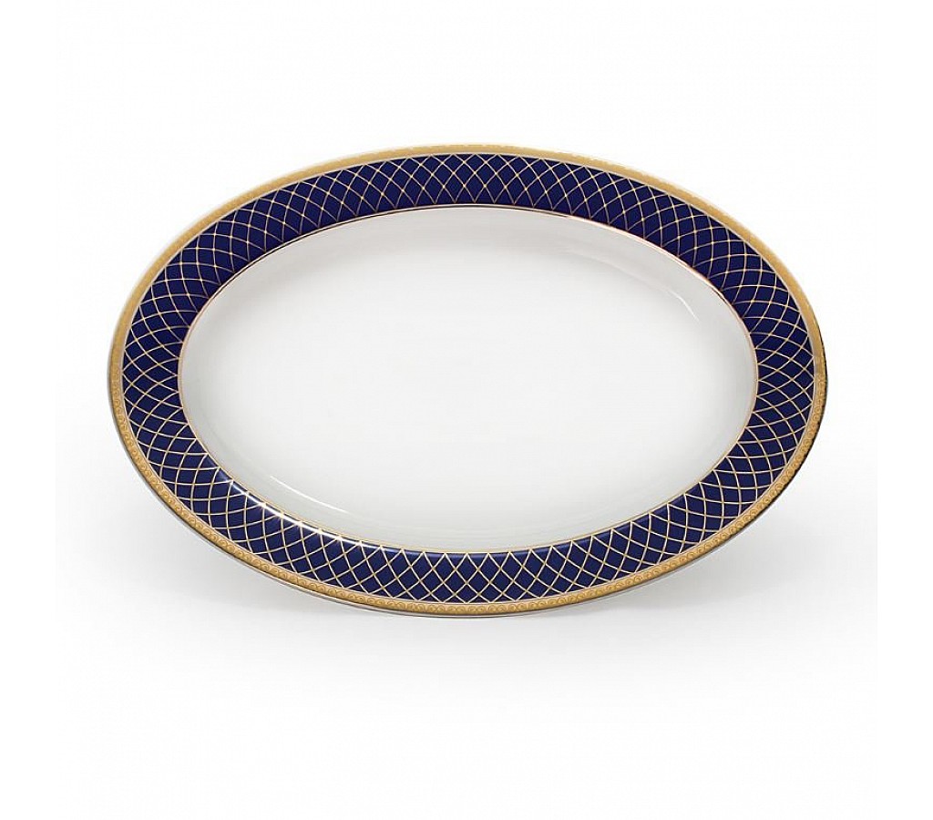 Блюдо овальное Аружан длиной 31,5 и шириной 22,5 см из тонкого костяного фарфора декорировано широким синим бортом и золотом 18 карат (750 проба). Рекомендуется мыть вручную. Нельзя использовать в СВЧ.