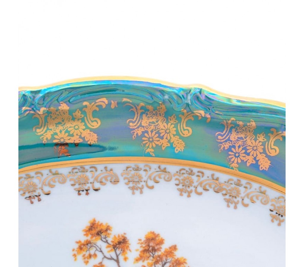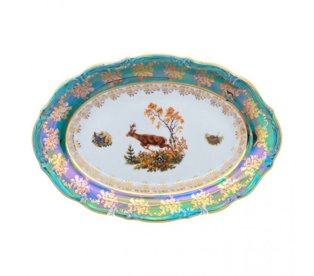 Блюдо овальное Repast Охота зеленая Мария-тереза R-L 28 см. Не подходит для использования в СВЧ-печи. Рекомендуется мыть руками во избежание повреждения декоративного покрытия. Обычная картонная упаковка.