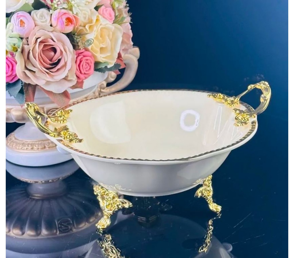 Глубокое блюдо 25 см Atlantis Cream Lenardi на ножках с ручками изготовлено из фарфора, с рельефным краем и золотой окантовкой. Изящные ручки и ножки изготовлены из облегчённого метала с качественным, анодированным покрытием под золото.