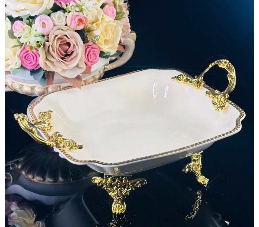 Глубокое блюдо 28 см Atlantis Cream Lenardi на ножках с ручками изготовлено из фарфора, с рельефным краем и золотой окантовкой. Изящные ручки и ножки изготовлены из облегчённого метала с качественным, анодированным покрытием под золото.