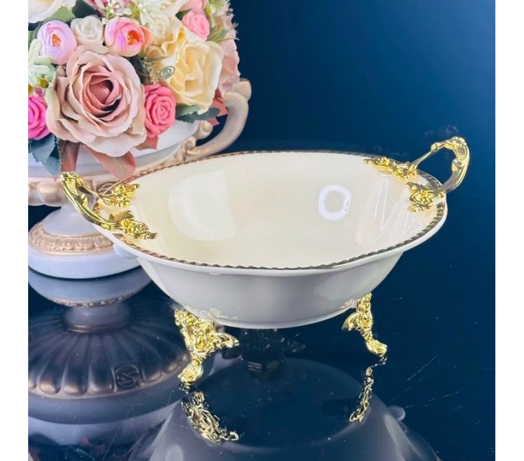 Глубокое блюдо 30,5 см Atlantis Cream Lenardi на ножках с ручками изготовлено из фарфора, с рельефным краем и золотой окантовкой. Изящные ручки и ножки изготовлены из облегчённого метала с качественным, анодированным покрытием под золото.