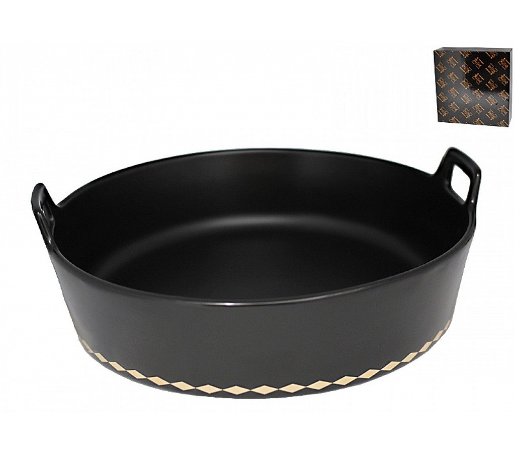 Глубокое блюдо с ручками Lenardi Tekito черный диаметром 25 см. Все предметы декоративного характера и предназначена для подачи и сервировки стола, их нельзя использовать в духовом шкафу или микроволновой печи.
