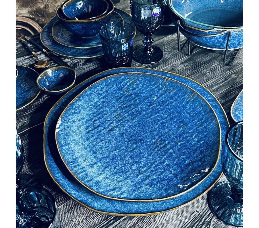 Коллекция Aquamarine изготовлена их фарфора, покрыта глянцевой цветной глазурью глубокого синего цвета с вкраплениями. Структура поверхности изделий имеет рельеф. Благодаря прочной и глянцевой глазури посуду легко мыть. Подходит для дома и для ресторанов.