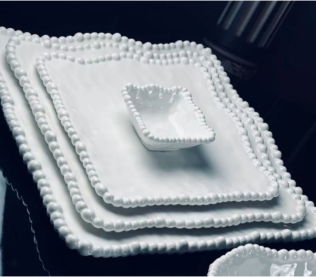Коллекция Маринет изготовлена из высококачественного фарфора. Волнистые края с отделкой небольшими жемчужинами напоминают край морской волны, легкая текстура напоминает поверхность моря. Посуду можно мыть в ПМ и использовать в микроволновой печи, что крайне важно и очень удобно. Посуда данной коллекции идеально подходит как для домашнего, так и профессионального использования в ресторанах, кафе. На прочной глазури не остается следов от столовых приборов.Коллекция представлена различными вариантами блюд, салатников, тарелок, менажниц а также чайными наборами, которые можно приобрести по штучно. Все предметы коллекции имеют индивидуальную подарочную упаковку.
