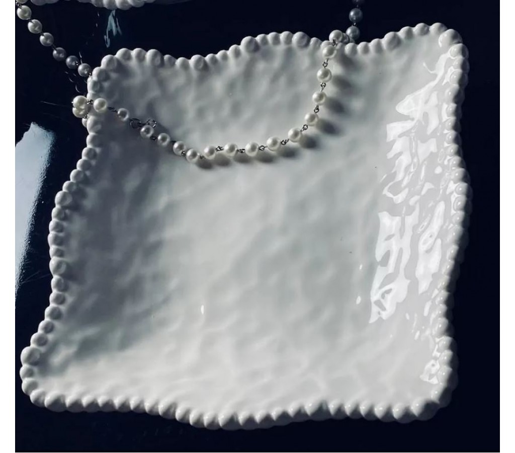Коллекция Маринет изготовлена из высококачественного фарфора. Волнистые края с отделкой небольшими жемчужинами напоминают край морской волны, легкая текстура напоминает поверхность моря. Посуду можно мыть в ПМ и использовать в микроволновой печи, что крайне важно и очень удобно. Посуда данной коллекции идеально подходит как для домашнего, так и профессионального использования в ресторанах, кафе. На прочной глазури не остается следов от столовых приборов.Коллекция представлена различными вариантами блюд, салатников, тарелок, менажниц а также чайными наборами, которые можно приобрести по штучно. Все предметы коллекции имеют индивидуальную подарочную упаковку.