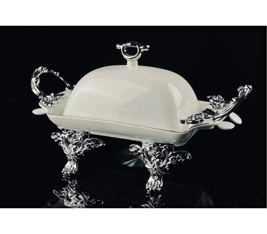 Масленка Atlantis Lenardi на ножках с ручками на ножках с ручками изготовлена из фарфора, с рельефным краем и серебряной окантовкой. Изящные ручки и ножки изготовлены из облегчённого метала с качественным, анодированным покрытием под серебро. Менажница идеально подойдет для сервировки праздничного стола.