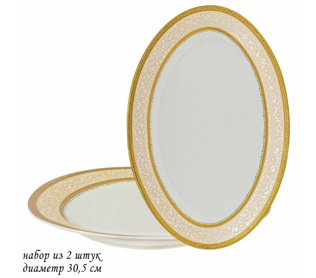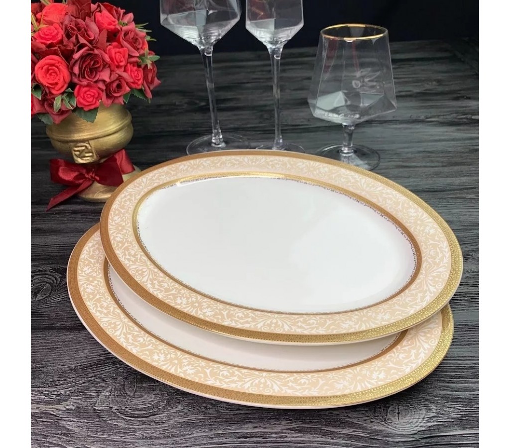 Наблор из 2 овальных блюд Элизабет Lenardi 30 см. Не рекомендуется использовать в микроволновой печи и мыть в посудомоечной машине, по причине возможного повреждения золотого декоративного покрытия.