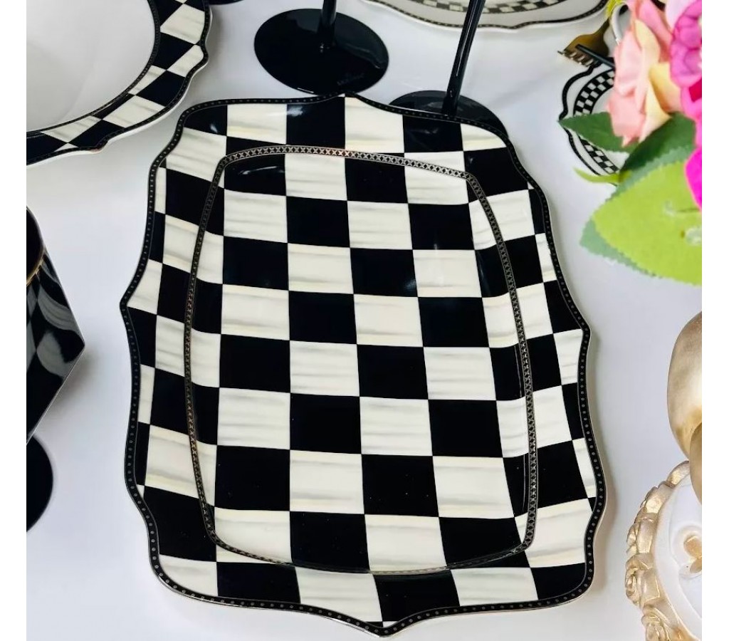Набор из 2 сервировочных блюда длиной 35,5 см Тристан Lenardi. Фарфоровые блюда декорированы нестареющим и всегда актуальным узором "шашечки" с золотой окантовкой. Упакованы в подарочную коробку. Не рекомендуется использовать в микроволновой печи и мыть в посудомоечной машине, по причине возможного повреждения золотого декоративного покрытия.