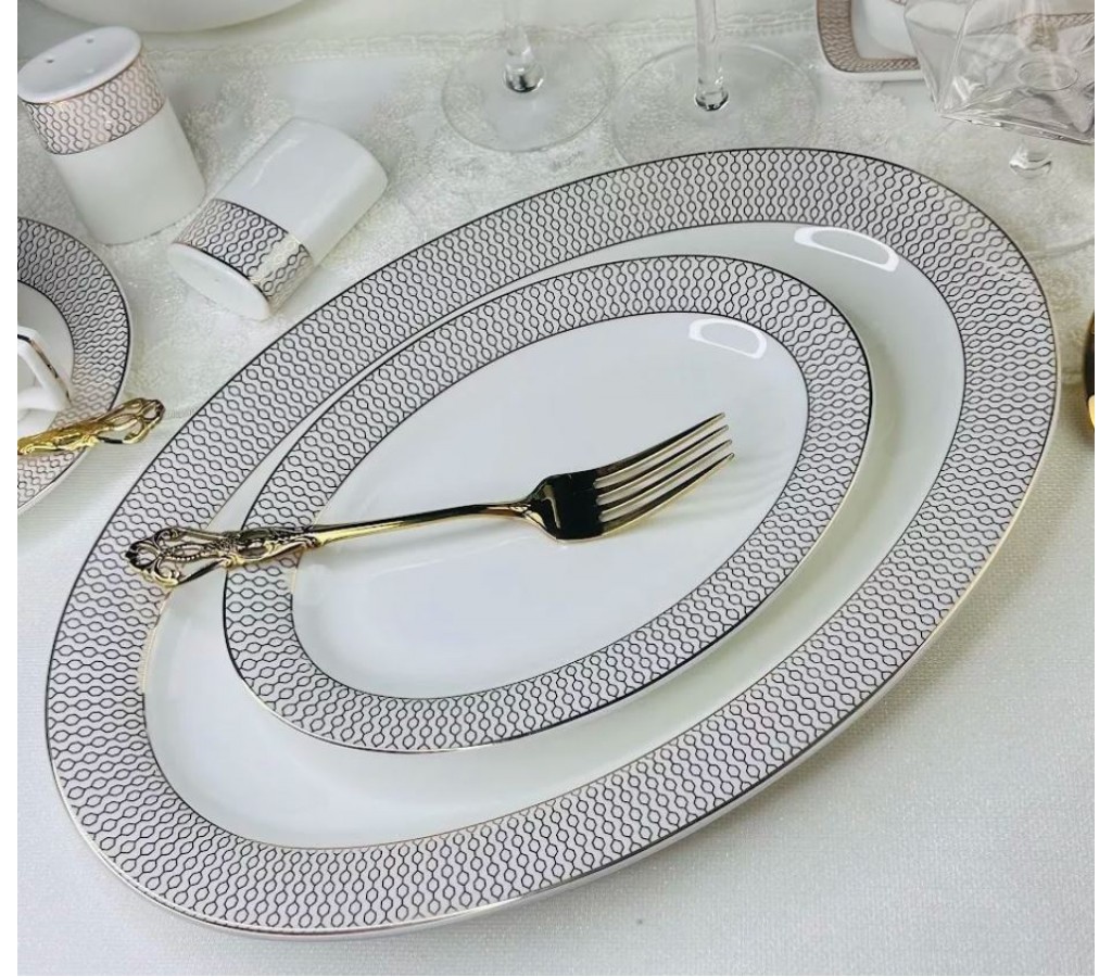 Овальное блюдо длиной 36 см Севилья Lenardi изготовлено из тончайшего костяного фарфора. Блюдо декорировано геометрическим ультрамодным декором в сочетании с золотой окантовкой.