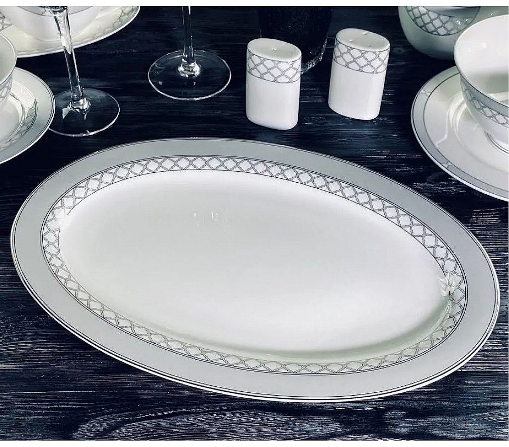 Овальное блюдо длиной 36 см Версаль серебро Lenardi изготовлено из тонкостенного фарфора высочайшего качества костяного фарфора. Блюдо декорировано под серебро с красивым орнаментом, что придает ему королевский шик и утонченную элегантность. Не рекомендуется использовать в микроволновой печи и мыть в посудомоечной машине, по причине возможного повреждения декоративного покрытия.