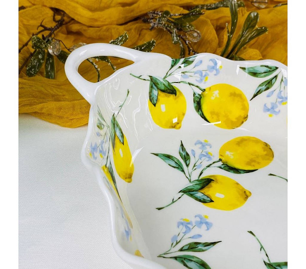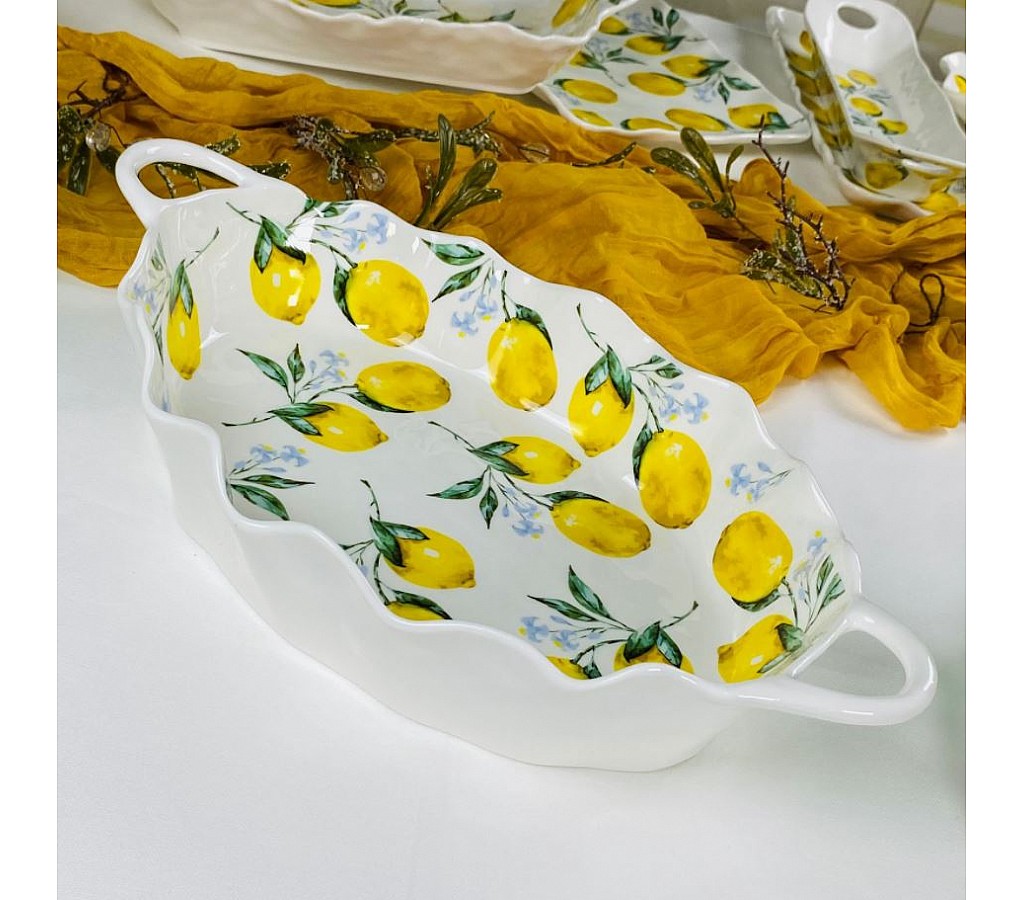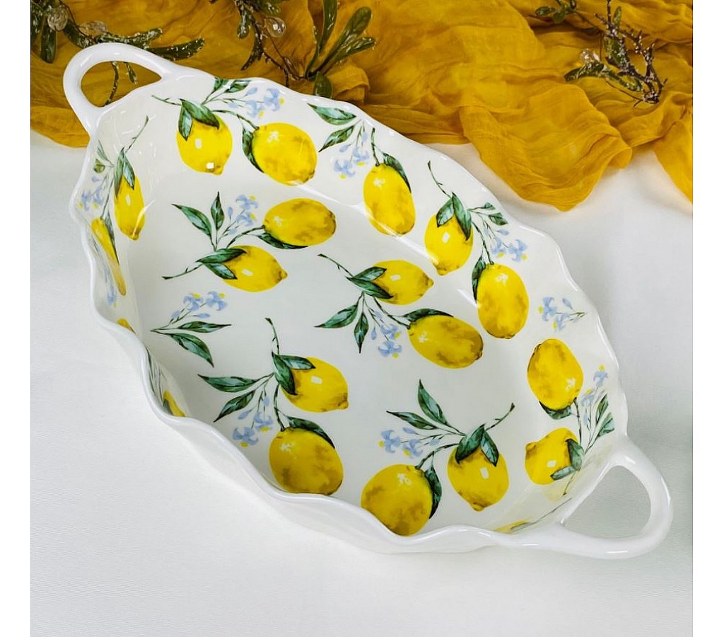 Овальное глубокое блюдо 38 см с ручками Лимоны Lenardi