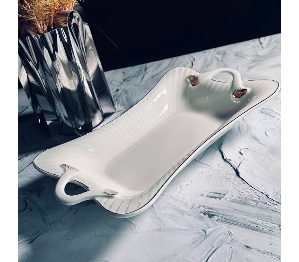 Прямоугольное блюдо 34 см Marzipan grey Lenardi с ручкамиi изготовлено из фарфора.Блюдо классической формы с элегантными ручками.Можно мыть в посудомоечной машине.