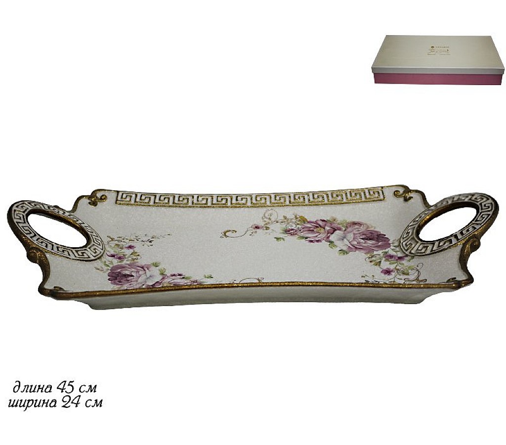 Прямоугольное блюдо с ручками Мраморная Lenardi. Длина 45 см. Ширина 24 см. Подарочная коробка.