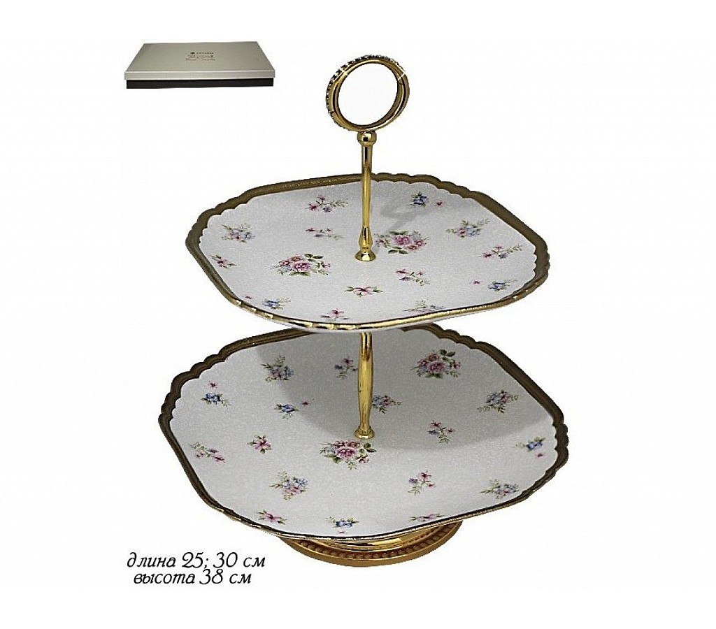 Двухъярусная этажерка Анемон мраморный Lenardi, высота 38 см, диаметр верхний ярус 25 см, нижний 30 см.