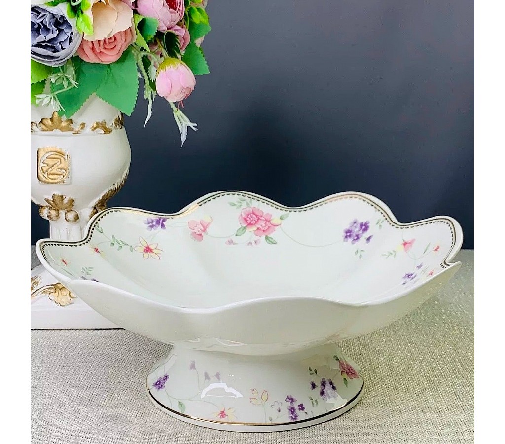 Фруктовница Lenardi Флоренс 24 см на ножке. Упаковано в подарочную коробку. Не рекомендуется использовать в микроволновой печи и мыть в посудомоечной машине, по причине возможного повреждения золотого декоративного покрытия.