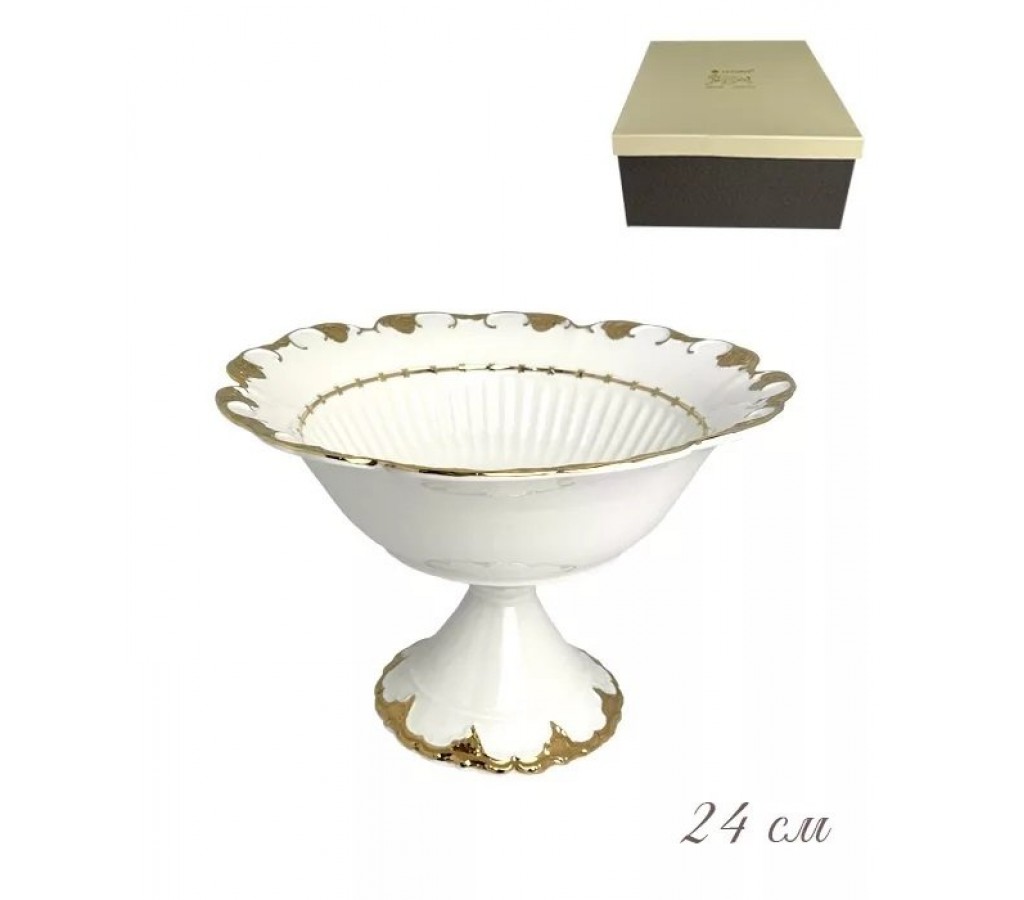 Фруктовница из фарфора Азазель Lenardi диаметром 24 см на ножке. Упакована в подарочную коробку. Не рекомендуется использовать в микроволновой печи и мыть в посудомоечной машине, по причине возможного повреждения декоративного покрытия.