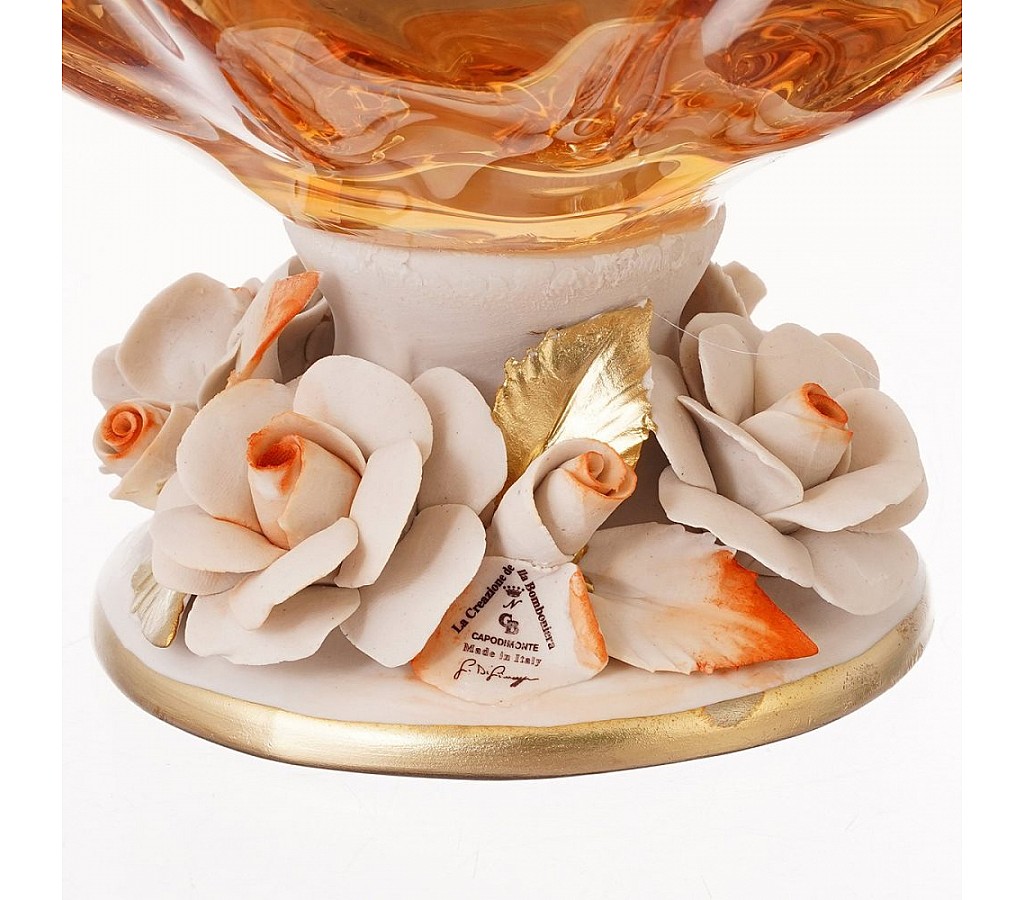 Ваза изготовлена из Муранского стекла, по старинным технологиям, возникшим на острове Мурано, рядом с Венецией.Главной отличительной особенностью венецианского стекла является то, что оно создается только вручную,и обладает уникальным узором, который неповторяется