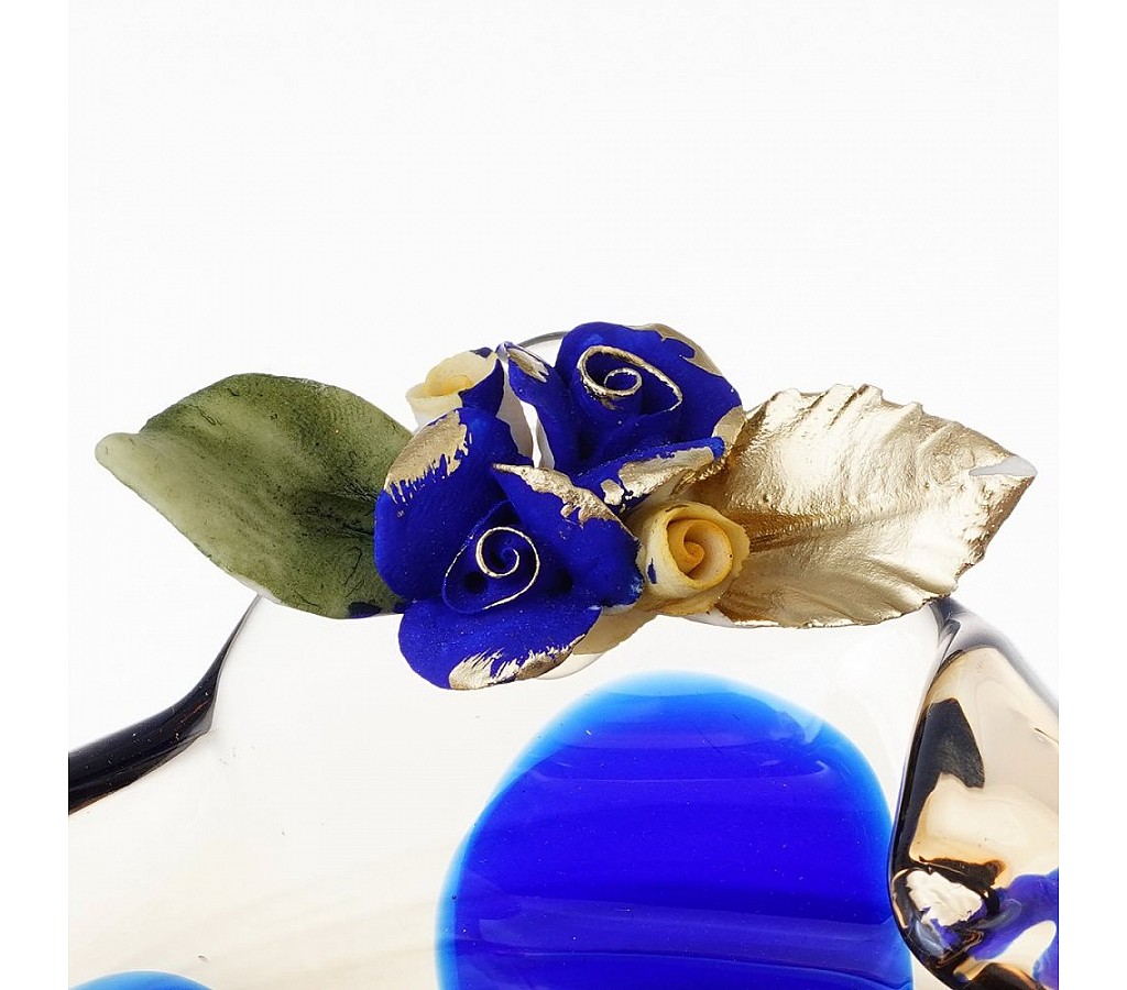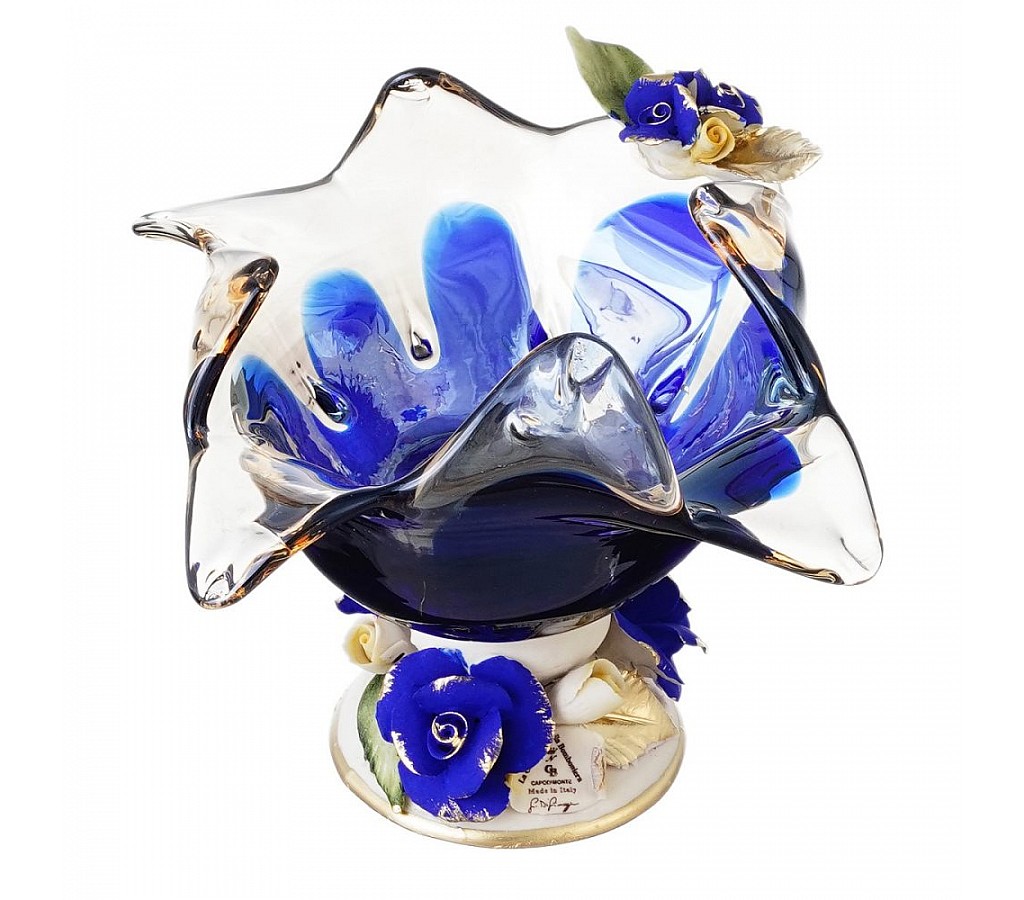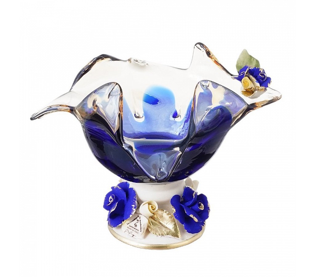 Ваза изготовлена из Муранского стекла, по старинным технологиям, возникшим на острове Мурано, рядом с Венецией.Главной отличительной особенностью венецианского стекла является то, что оно создается только вручную,и обладает уникальным узором, который неповторяется