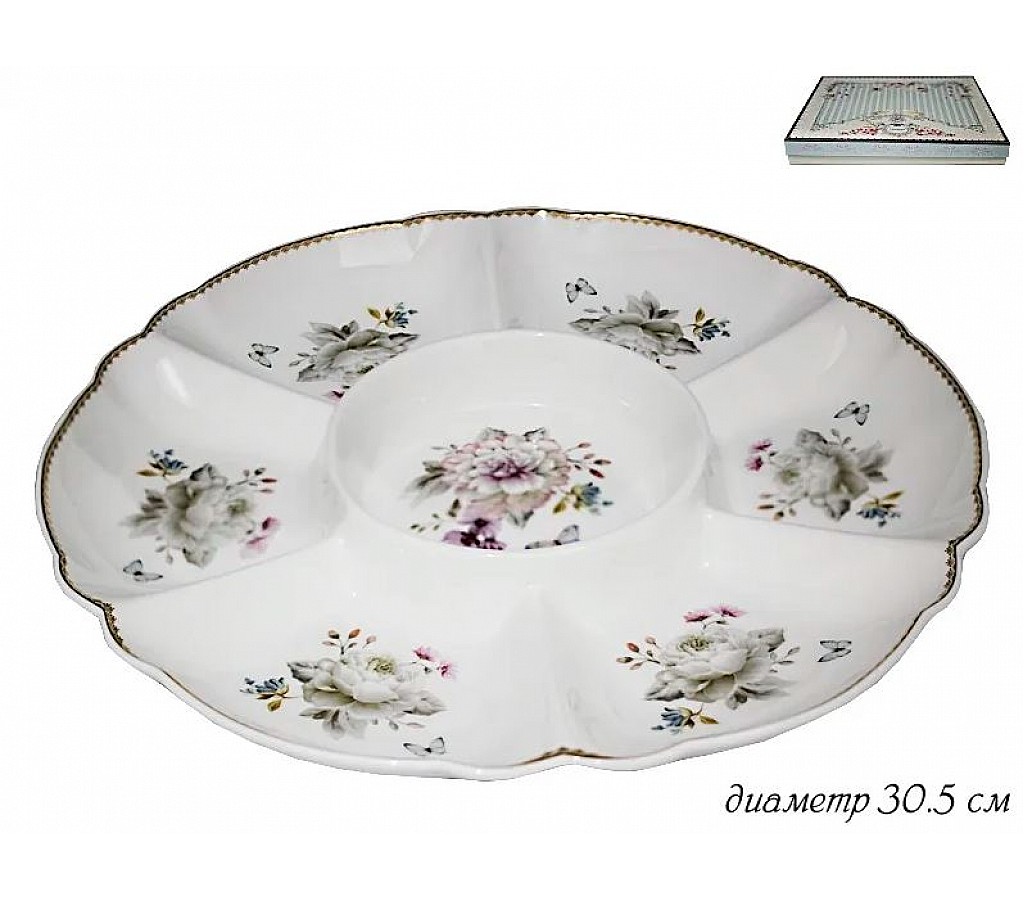 Коллекция ХРИЗАНТЕМЫ изготовлена из фарфора. Нежный цветочный декор с объемным эффектом и отводкой золотом, подчеркивает изысканность формы. Коллекция включает в себя широкую линейку: столовые и чайные сервизы, тарелки, салатники, блюда, фруктовницы, менажницы, тортовницы и другие предметы сервировки. Не рекомендуется использовать в микроволновой печи и мыть в посудомоечной машине, по причине возможного повреждения декоративного покрытия. Менажница упакована в подарочную коробку.