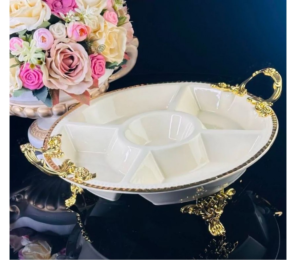 Менажница 33 см Atlantis Cream Lenardi на ножках с ручками изготовлено из фарфора, с рельефным краем и золотой окантовкой. Изящные ручки и ножки изготовлены из облегчённого метала с качественным, анодированным покрытием под золото.