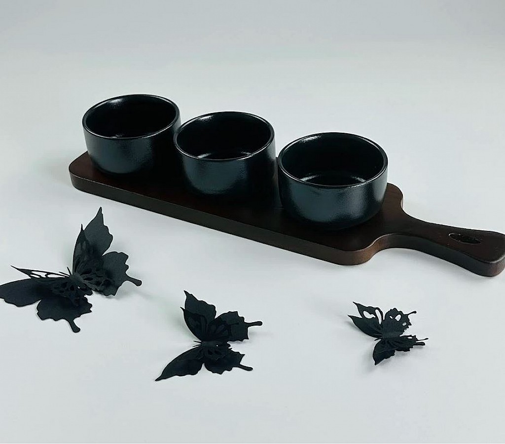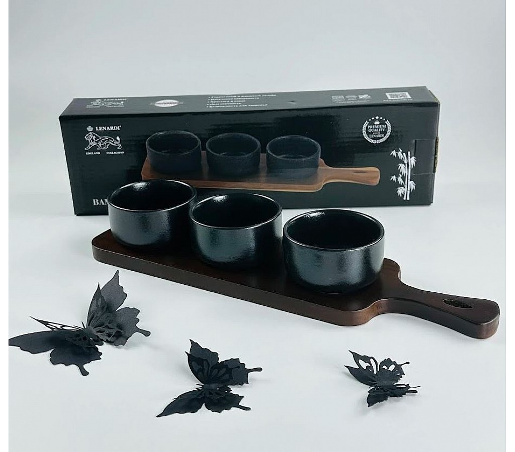 Новая серия изделий из фарфора и дерева Blackwood от мирового бренда LENARDI. В нее вошли сахарница, масленка, менажницы, банки для хранения, салатники на подставке, тортовницы, сервировочные блюда и т.д. В дизайне сочетается черный цвет глазури и темное дерево, которое подчеркивает экологичность данного продукта, современный стиль и элегантность. Предметы выполнены из фарфора высшего качества и натурального дерева. Фарфоровые изделия пригодны для использования с СВЧ печи и мытья в посудомоечной машине. Все изделия коллекции упакованы в индивидуальные подарочные коробки. Объем салатника 100 мл диаметр 6х4 см -высота