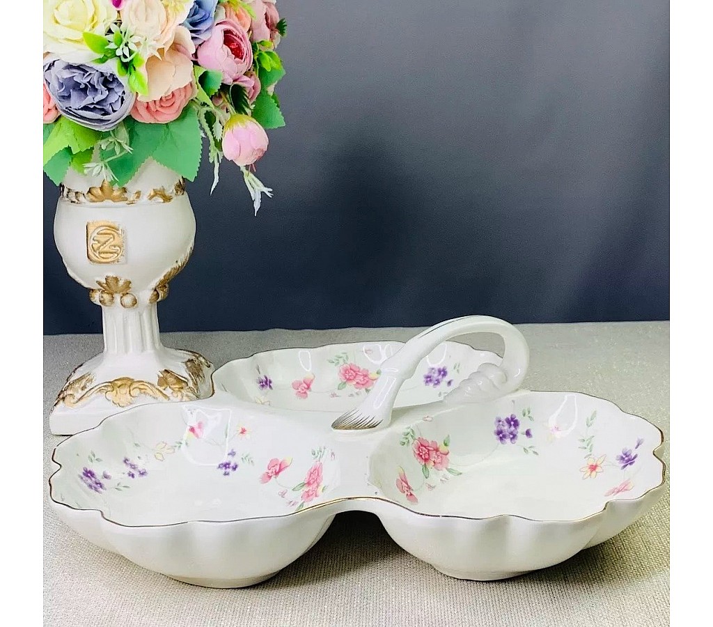 Менажница Lenardi Флоренс 28 см. Упакована в подарочную коробку. Не рекомендуется использовать в микроволновой печи и мыть в посудомоечной машине, по причине возможного повреждения золотого декоративного покрытия.