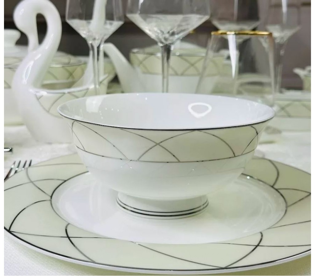 Набор из 6 салатников диаметром 15 см Pandora Lenardi изготовлен из тончайшего костяного фарфора. Декор отличает классическое бело-бежевое сочетание цветов дополненное элегантными платиновыми полосками. Легкий, прочный и долговечный фарфор. Упакован в подарочную коробку. Не рекомендуется использовать в микроволновой печи, по причине возможного повреждения декоративного покрытия.