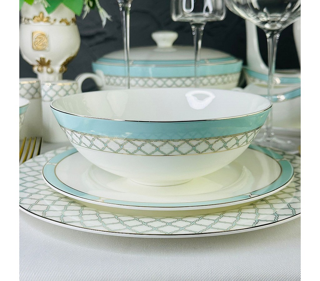 Набор из 6 салатников диаметром 18 см Версаль Lenardi изготовлен из тончайшего костяного фарфора. Набор декорирован бирюзовым цветом с красивым орнаментом, что придает ему королевский шик и утонченную элегантность . Упакован в подарочную коробку. Не рекомендуется использовать в микроволновой печи и мыть в посудомоечной машине, по причине возможного повреждения декоративного покрытия.