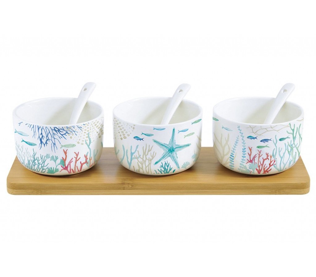Набор для закусок Море Easy Life 7 предметов: 3 салатника диаметром 8 см, объемом 0.17 л, 3 ложки, поднос. Можно использовать в СВЧ-печи. Можно мыть в посудомойке.
