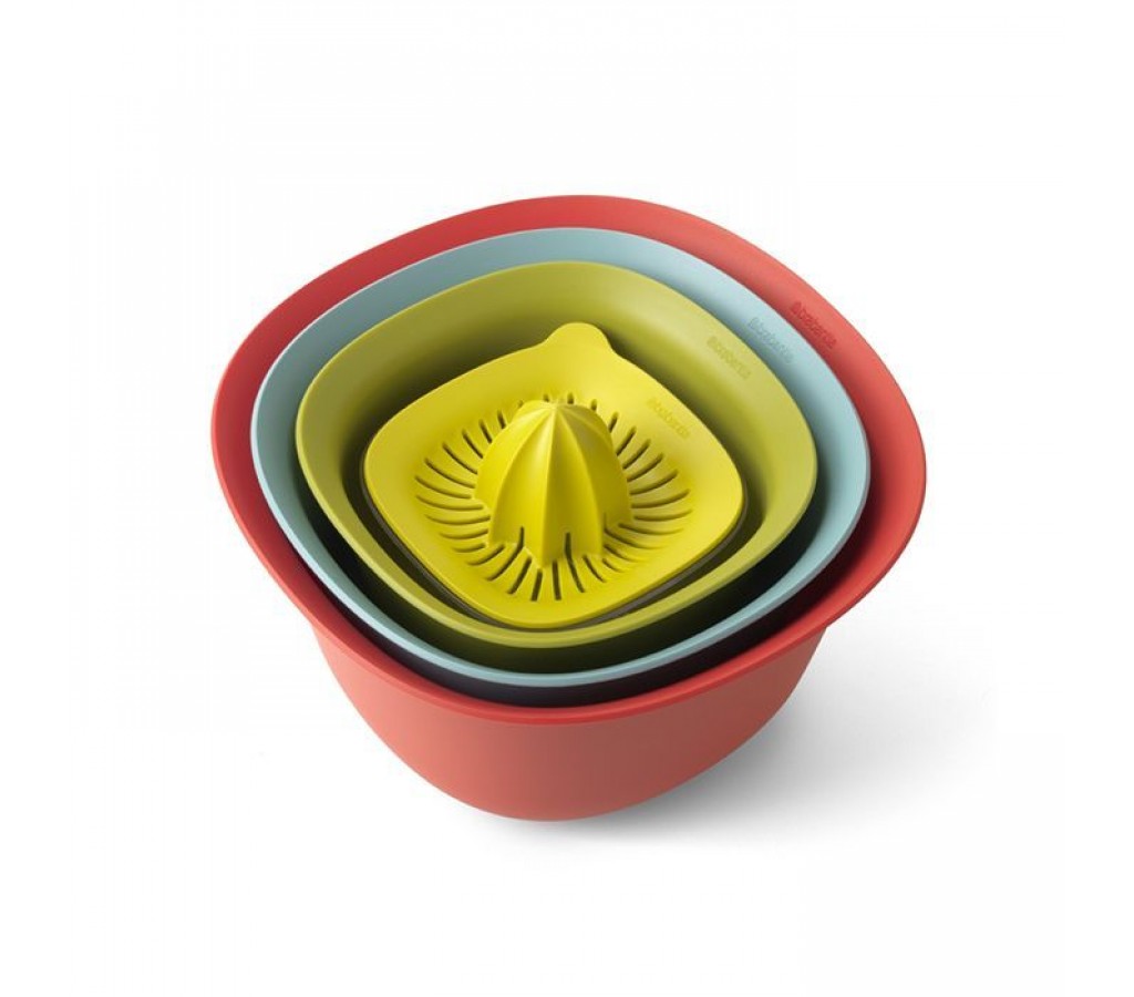 В набор входят: миски 1,5 и 3,2 л, дуршлаг, соковыжималка для цитрусовых с мерным стаканом. Экономия места на кухне и удобное хранение в выдвижном ящике – изделия составляются одно в другое. Легко моются – можно мыть в посудомоечной машине. Миски и мерный стакан имеют нескользящее основание. Мерный стакан вместимостью 500 мл имеет четкие мерные деления в мл, пинтах, порциях и жидких унциях. Соковыжималка подходит для приготовления сока из любых цитрусовых. Гарантия 5 лет.