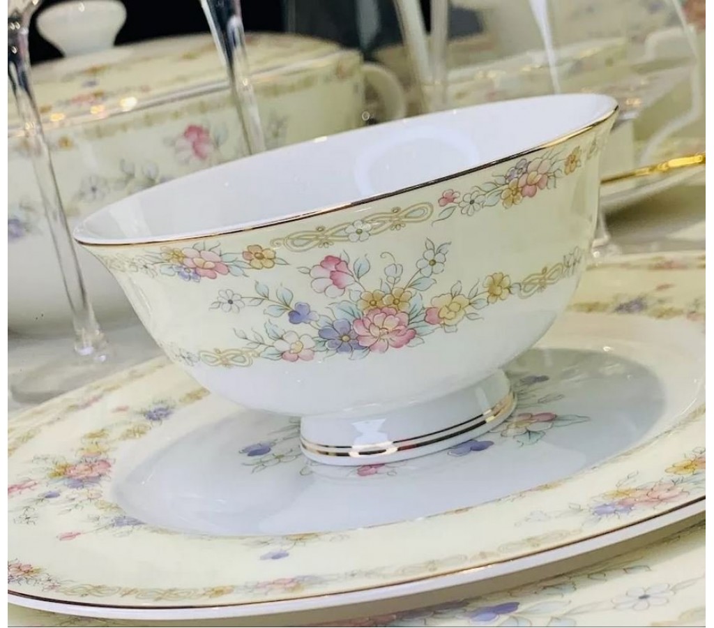 Набор из 2 маленьких фарфоровых салатников Fleur Lenardi диаметром 11 см. Мелкие цветочный дизайн на фоне бежевого бортика смотрится нежно и воздушно. Золотая обводка добавляет роскоши и изящества. Набор изготовлен из костяного фарфора, легкого, прозрачного и белого. Не рекомендуется использовать в микроволновой печи и мыть в посудомоечной машине, по причине возможного повреждения золотого декоративного покрытия.