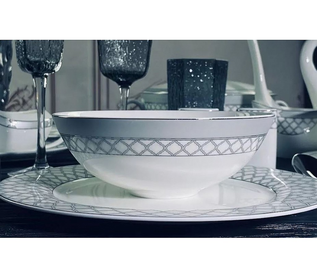Салатник 18 см Версаль серебро Lenardi изготовлен из тонкостенного фарфора высочайшего качества костяного фарфора, декорирован под серебро с красивым орнаментом, что придает ему королевский шик и утонченную элегантность.