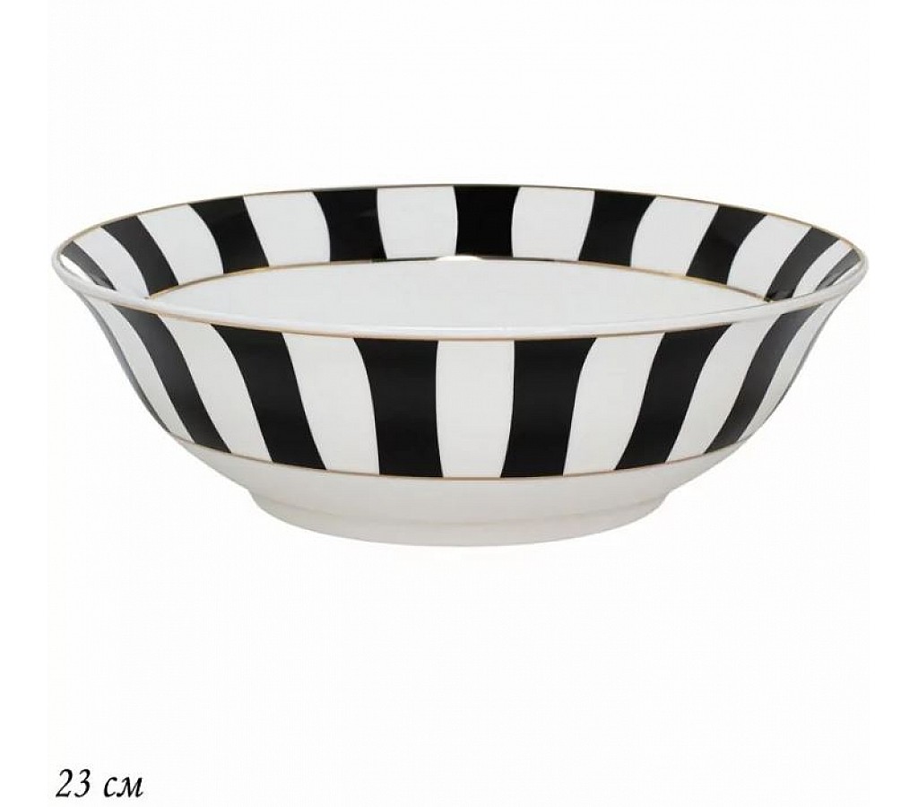 Салатник 23 см Жаклин Lenardi изготовлен из фарфора высочайшего качества. Салатник декорирован нестареющим и всегда актуальным контрастным черно-белым декором, удачно сочетающимся с золотой окантовкой. Упакован в подарочную коробку.Не рекомендуется использовать в микроволновой печи и мыть в посудомоечной машине, по причине возможного повреждения золотого декоративного покрытия.