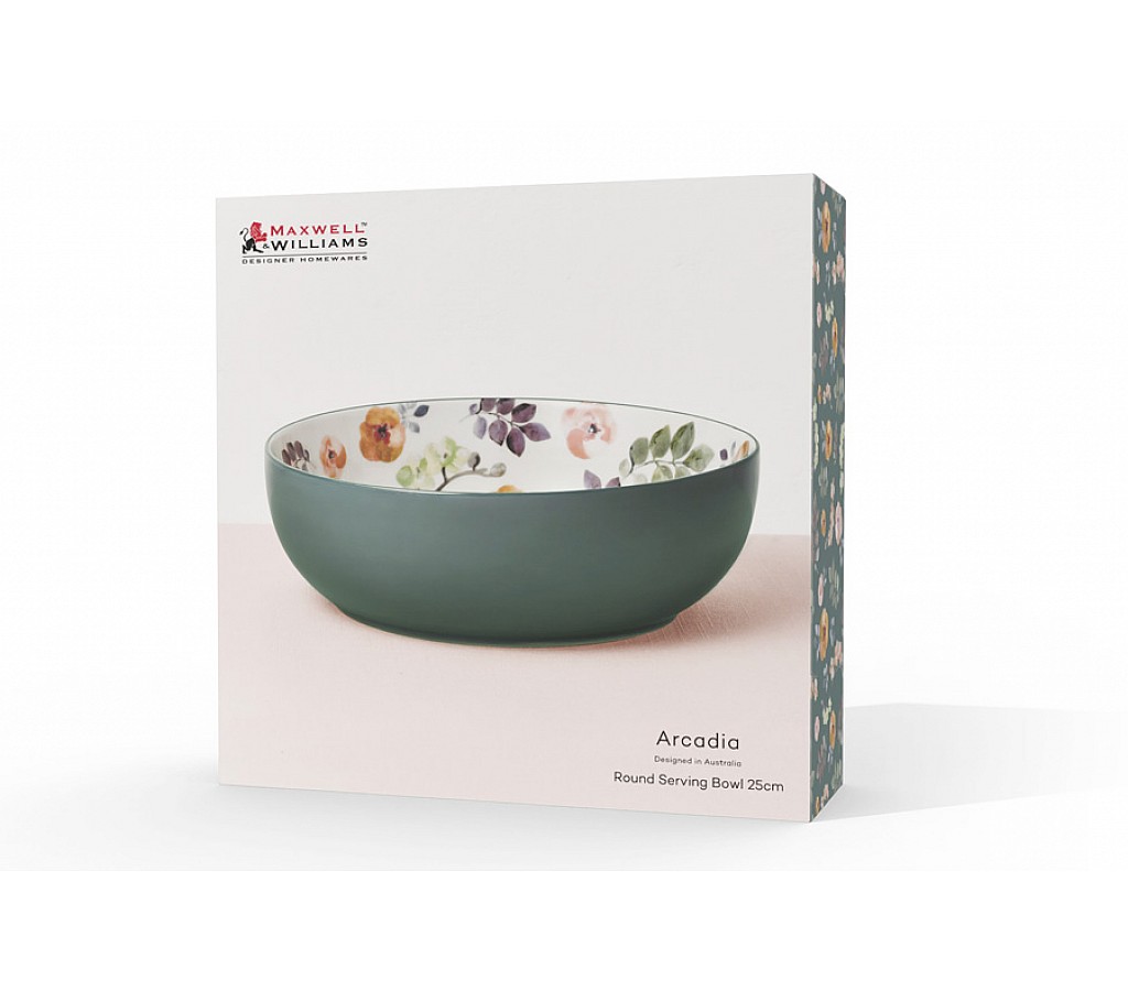 Салатник Arcadia Maxwell & Williams диаметром 25 см объемом 2,5 л. Подарочная упаковка. Мыть тёплой водой с применением жидких моющих средств. Можно использовать в СВЧ и мыть в посудомоечной машине.