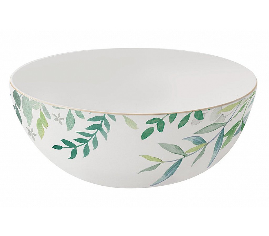 Салатник диаметром 22 см серии «Амазония» итальянской марки Easy Life R2S (Изи Лайф) изготовлен из прочного и качественного белого фарфора. Декор выполнен в виде нежного растительного орнамента разных оттенков зеленой акварели, законченность изделию придает изысканный золотой кант. Подходит как для подачи горячих, так и холодных блюд.