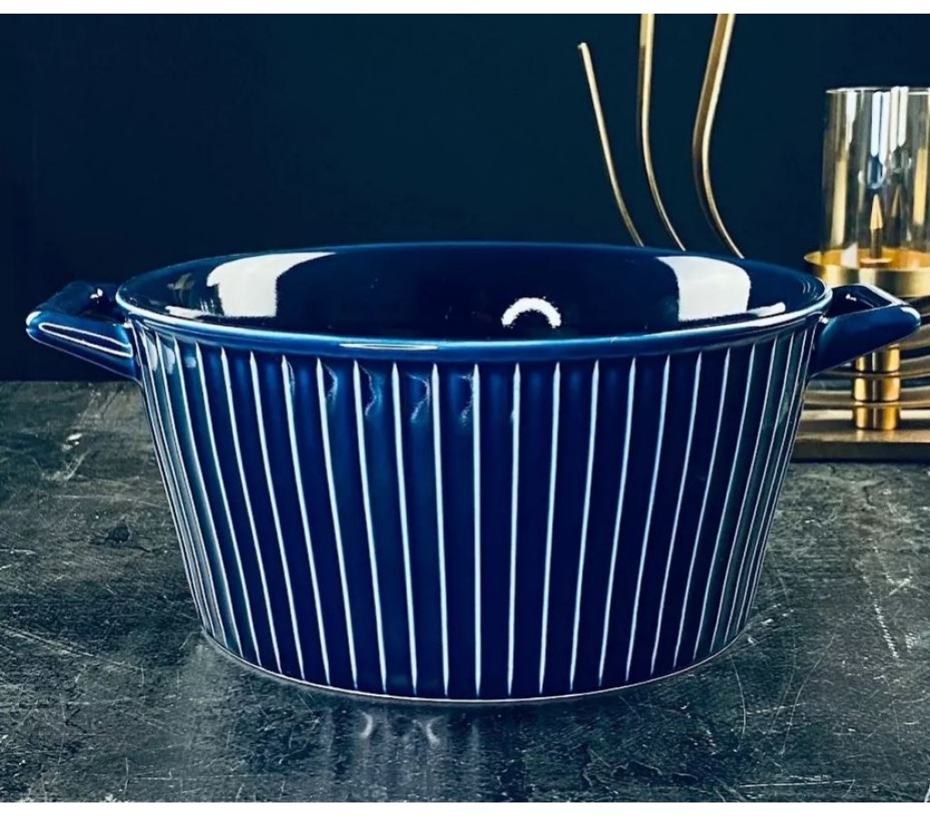 Изготовлен из фарфора, покрыт глянцевой цветной глазурью глубокого синего цвета с вкраплениями. Подходит для дома и для ресторанов.