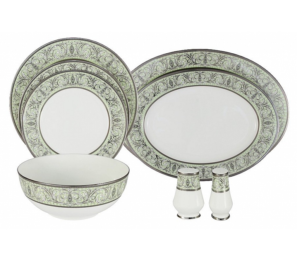 Благородный сервиз Блеск Narumi – решение не на каждый день. Величественный набор, вдохновленный красотой императорских покоев эпохи Мэйдзи, выполнен в лаконичных зеленых тонах, слегка приглушенных. Растительные мотивы напоминают красоты японских садиков, а основа цвета слоновой кости создаёт удивительную цветовую гармонию.